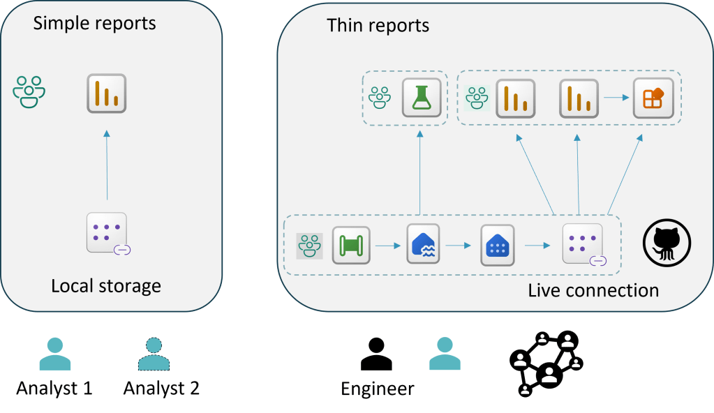 The analyst updates their report in their own workspace. They can be granted contributor access report workspace. The workspace is integrated with Git.